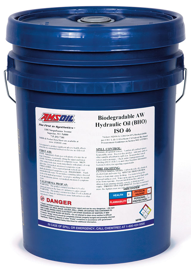 AMSOIL Biodegradable Hydraulic Oil (BHO) is a premium performance hydraulic oil designed to biodegrade when subjected to sunlight, water and microbial activity. Manufactured with a high quality blend of oleic vegetable oils and customized synthetic esters, it meets the U.S. Federal bio-based procurement guidelines as defi ned in Section 9002 of the Farm Security and Rural Investment Act of 2002 (FSRIA).
