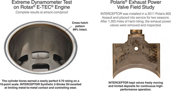 Two-stroke powersports engines have evolved to run on leaner gas-to-oil mixtures, increasing harmful friction and heat. INTERCEPTOR's synthetic formulation incorporates high-molecular-weight components with high flash points that resist burn-off. As a result, a greater amount of oil survives the combustion process to provide lubrication and protection. Its excellent lubricity and film strength inhibit metal-to-metal contact. In extreme dynamometer testing, INTERCEPTOR's anti-scuff/anti-wear formula completely prevented piston skirt scuffing.