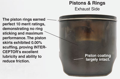 INTERCEPTOR naturally resists harmful deposits due to its thermally stable synthetic formulation. It is additionally fortified with high-temperature detergency and dispersancy additives that provide excellent engine cleanliness. In extreme dynamometer testing, INTERCEPTOR completely prevented piston ring and exhaust power valve sticking for maximum performance. It also limited piston, combustion chamber and spark plug deposits for reliable operation.