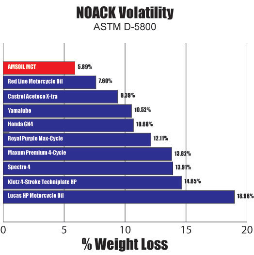 AMSOIL Synthetic Motorcycle Oil. AMSOIL 10W-30 keeps engines running cool by effectively reducing friction and heat, and it contains a heavy treatment of anti-wear additives to reduce wear regardless of the operating conditions (see Four-Ball Wear Test graph below). AMSOIL MCT is thermally (heat) stable and contains maximum levels of oxidation inhibitor additives. It is extremely resistant to volatility (see NOACK Volatility graph on reverse) and engineered to prevent damaging sludge and carbon deposits for superior engine cleanliness.